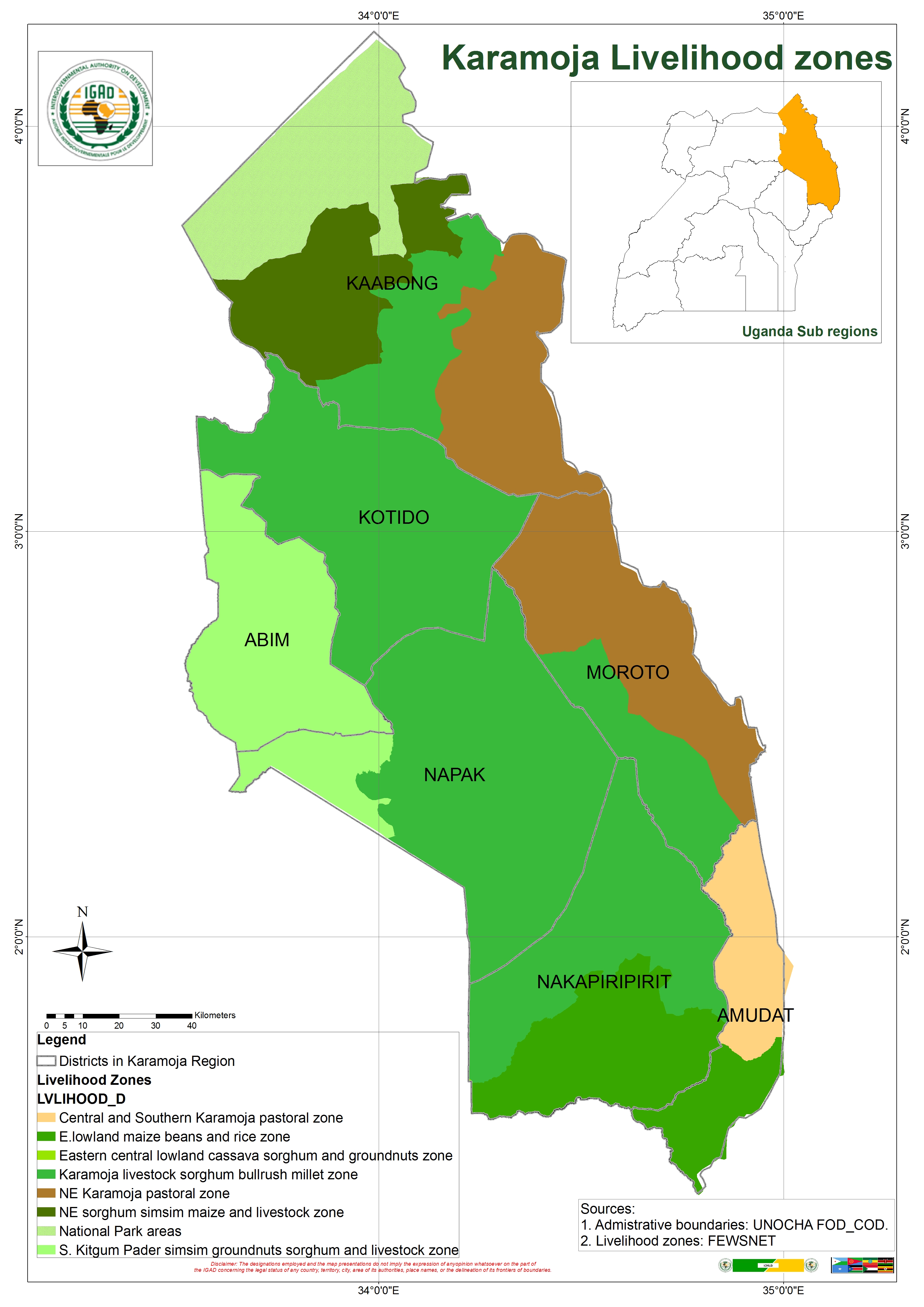 The maps describes spatially the livelihood zones across the Karamoja sub region in Uganda. Karamoja sub region borders both Kenya and South Sudan.