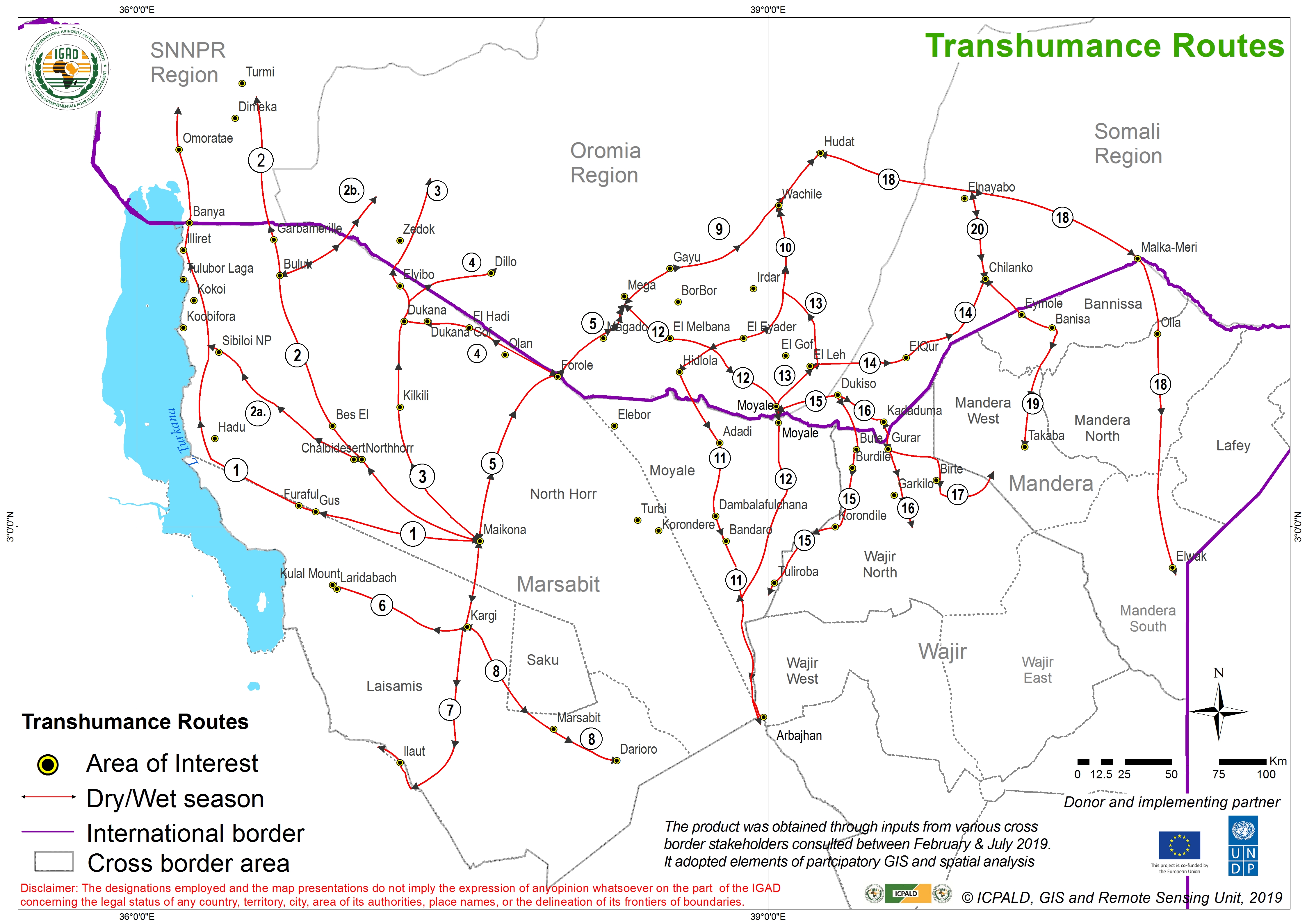 Mapping initiative focused on participatory mapping approaches through a series of 3 community mapping sessions with stakeholders from border areas Marsabit, Wajir county; Kenya, SNNPR , Oromiya and Somali regions of Ethiopia. This process was initiated and validated in 2019 by bringing forth subject matter specialists and cross border pastoral communities, provided for a platform to incorporate spatially local knowledge and perspectives while still integrating modern/current spatial techniq…