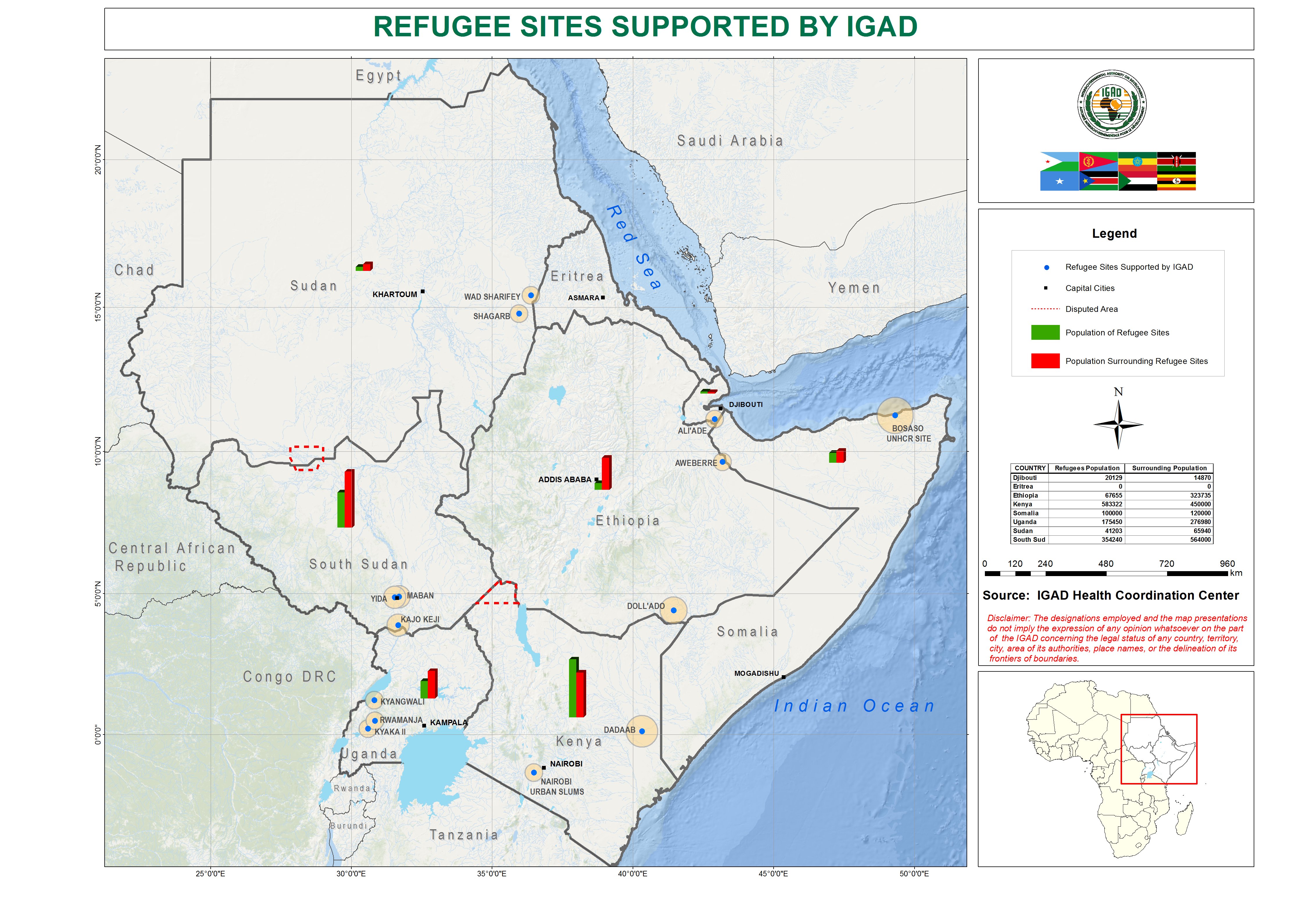 Map shows refugee sites supported by IGAD under IRAPP. This includes the country supported refugee population and the surrounding populations.