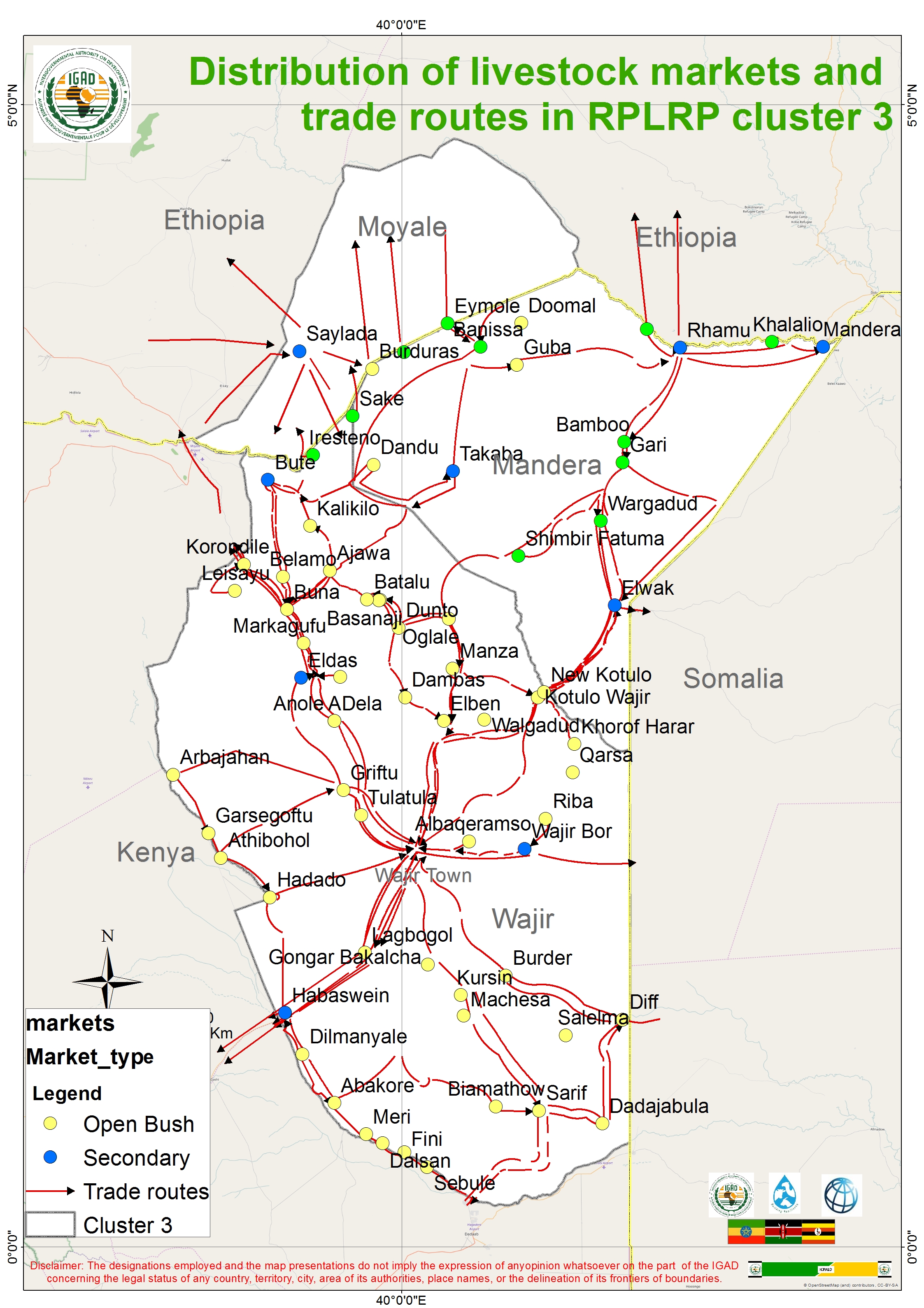 The map displays the spatial distribution of livestock markets per type (open bush, primary and secondary) as well as trade routes along Ethiopia-Kenya border. The extent covered is part of the broader IGAD cluster 2 and 3.